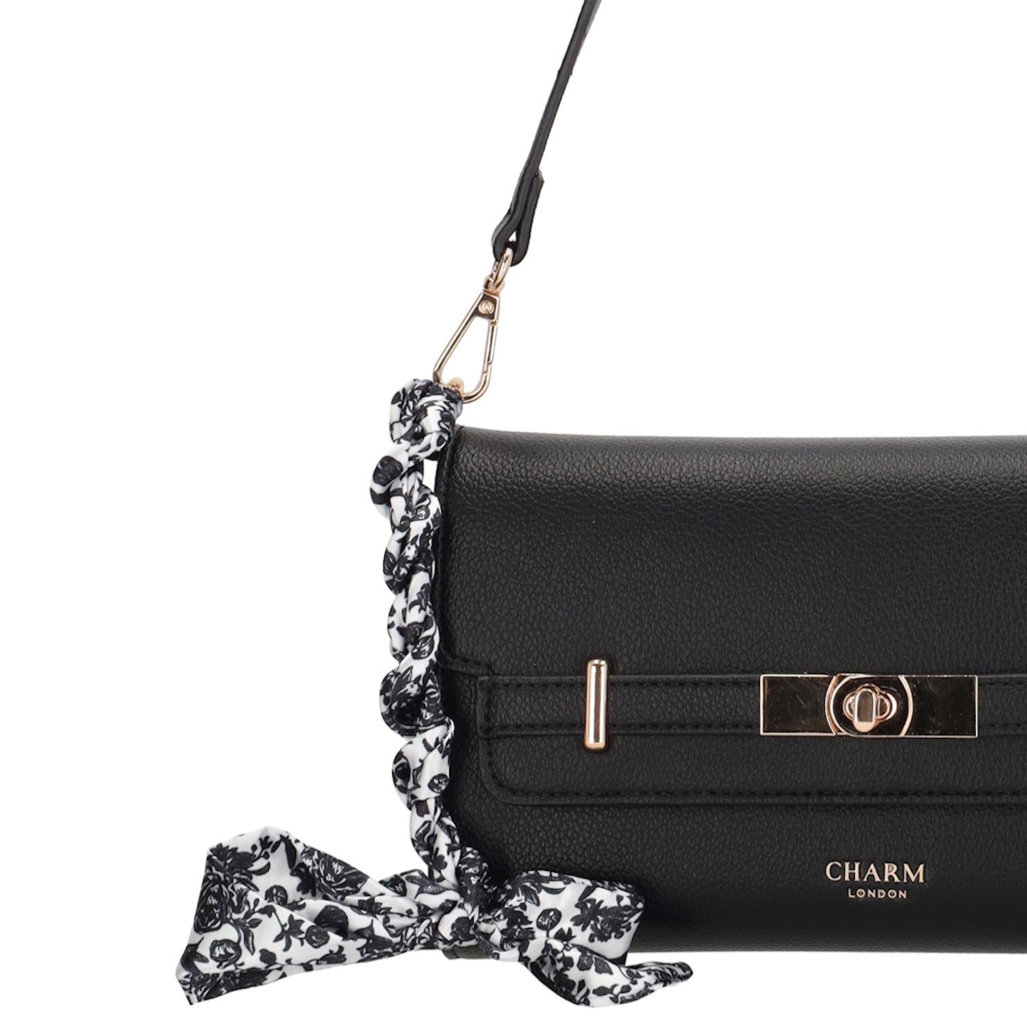 Deze schoudertas van Charm London heeft een stijlvolle klep met magneetsluiting, waardoor je spullen veilig en overzichtelijk zijn opgeborgen. De zwarte kleur met gouden details geeft de tas een luxe uitstraling die moeiteloos combineert met elke look, van casual tot chic.