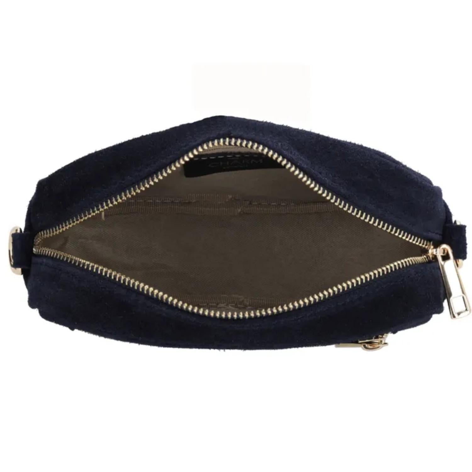 Ga voor een mooie look met dit suède tasje Charm! De tas heeft een mooie look met stijlvolle goudkleurige details.
